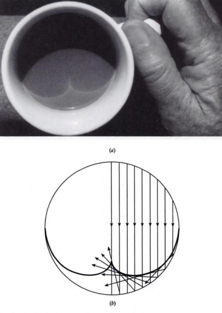 It might have happened for you that you saw a bright line in your coffee cup in a sunny day, as depicted in figure.1(a). It is a kind of focusing; If one ideally considers the sun as a point source, its parallel rays envelop a curved surface after reflection from the inner curved surface of the cup (figure.1(b)). This focus, however, is different from the perfect point focus we can produce using a cylindrical mirror; It is a typical natural behavior of light the observation of which doesn’t need a special experimental preparation, as it is the case for producing those focal points by a mirror. This generic structure also illustrates a structural stability: while any distortion of the mirror will immediately destroy the focus, the generic structure in the coffee cup will not disappear by deforming the shape of the cup, but would merely move.