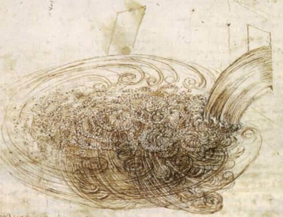 Interestingly, natural vortices were also appeared in one of Leonardo da Vinci’s painting: “Studies of water passing obstacles and falling” (figure.6). In this work, dated around 1508, he depicted the movement of actual water molecules in circular paths around the vortex. This form of swirling waves are natural patterns produced by falling water into a pond.