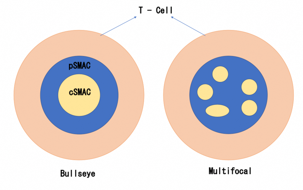 Another possible form of the synapse is a multifocal IS and it is observed when the micro-clusters of TCR-pMHC scatter at the multiple sites at the interface instead of fusing to the center. Both bullseye and multifocal structures of IS are depicted in the figure.