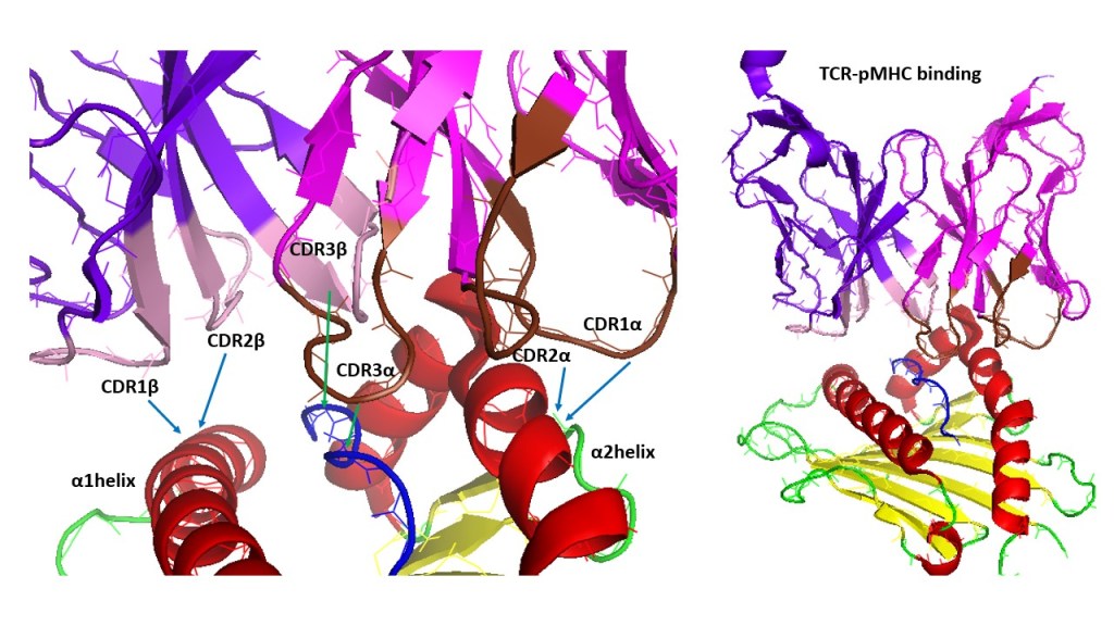 T-Cell receptor (TCR) is the key mediator in adaptive cell mediated immune response. A complex molecular mechanism, many processes of which aren’t yet fully known, underlies the intrinsic ability of TCRs to recognize a broad range of their target molecules. These target molecules or binding partners of TCRs are universally linear antigenic peptides which bind to major histocompatibility complex molecules (p-MHC) arrayed on antigen presenting cells (APCs). In fact, APCs should first bind to the antigenic peptides in order to offer them to TCRs. Therefore, at the heart of the immune response process is a receptor-ligand interaction between variable domains on the TCR and a peptide cradled in the groove of MHC molecules.