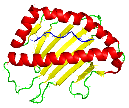 The antigenic peptide (shown in blue) is first bound in the groove on the surface of MHC protein. A large 8-stranded ß-sheet (shown in yellow) forms the bottom of the antigen-binding groove of the MHC molecule. This ß-sheet is a common feature of every MHC molecule. With two flanking helices exposed for interaction (shown in red), MHC molecule offers the linear antigenic peptide to TCRs creating a relatively flat TCR-pMHC contacting face. The ß-sheet floor enforces a common TCR diagonal docking onto MHC.