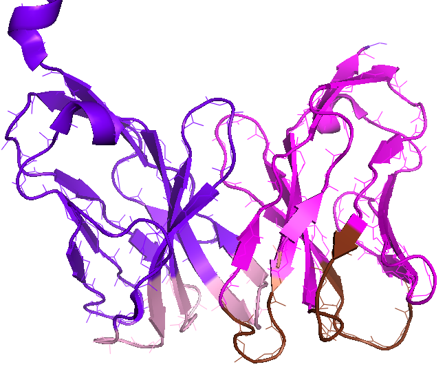 The majority of T-cells express TCR as a heterodimer protein consisting of alpha- and beta-chain; Each chain in TCR possesses two specific domains; While C-domain is required for the complete localization of TCR on the cell surface, V-domain from gene segments – V(variable) and J(joining) genes recombination for alpha-chain (colored in magenta in figure) and V, J, and D(diverse) genes recombination for beta-chain (colored in purple) – serves as antigen recognition site. This subpart of TCR, shown in figure (PDB 3TF7), interacts with p-MHC complex. The site-specific gene-recombination in V-domain of the TCR generates the extraordinary ligand specificity and sensitivity of TCRs. Six loops, three for alpha-chain (brown) and three for beta-chain (pink) in V-domain, denoted as complementarity determining region (CDR), determine the specificity of TCR for p-MHC ligand.