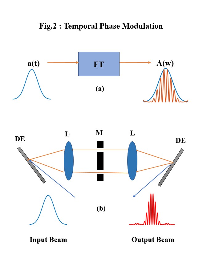 A process of producing a beat pattern by interfering two selected frequencies is shown in Figure2.b. The mask (M) is acting as Young’s double slits which can be generally designed for a desired spectral phase. The lenses (L) are the practical elements of Fourier transformation; The first lens is to transform the input diffracted temporal pulse (Input beam) into frequency domain to be shaped by the mask. The selected frequencies can posses various phase differences, induced by the mask, to produce different shapes of the beam pattern. The second lens combine the selected shaped frequencies and transform them again into time domain. Here, the final beam pattern (output beam) is simulated by interfering of two selected frequencies with a phase difference of pi. This technique, known as pulse shaping, can be applied for producing different patterns by shaping both amplitude and phase.