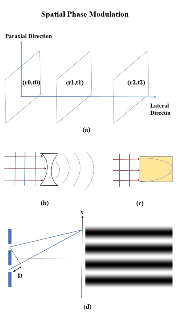 In both kind of lenses, different points on the incident plane wave experience various speed due to the difference in the refractive index and, as a result, the emerging wave front exhibits a kind of sphericity. Another simple way to change the spatial part of the dynamical phase is to directly varying the pathlength of the light beam. This tactic was used in the well-known Young’s Double-slits experiment. In his set-up (Figure (d)), the pathlength of the secondary waves (waves appeared in front of the slits) to the point of observation are different. Consequently, there is a phase difference which causes the interference effects. The observed bright and dark fringes – as displayed in the right side of the figure – are the result of this spatial phase modulation; As if to say, the phase differences causes intensity variation.